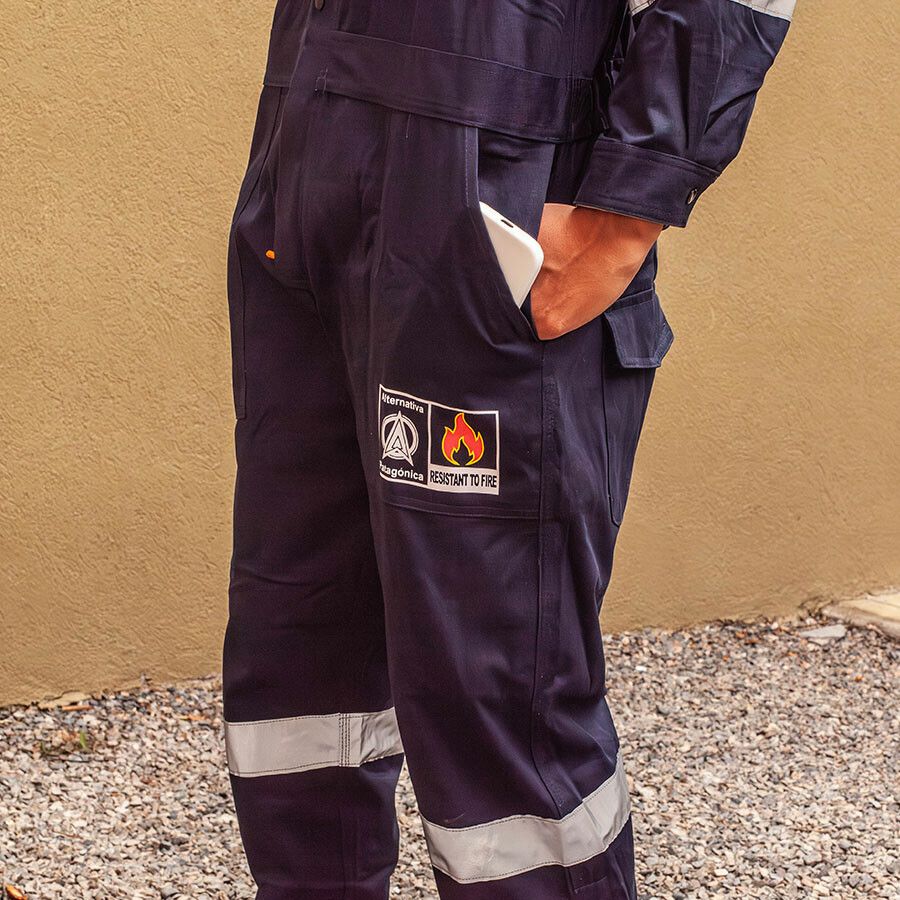 Cierre frontal con cierre reforzado doble cremallera y tapa cubre cierre con broche plastico anti estatica, y por debajo lleva bajo vista cierre. Con esto el cierre queda cubierto por debajo y por arriba. El cerrado general de la prenda es cañon triple costuras reforzada. Al igual que cuello, puños, cintura, bolsillos y ruedo doble costura reforzada.